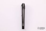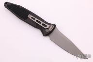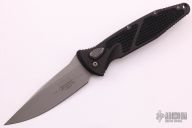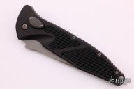 This Socom Elite automatic folder by Microtech Knives has a bead blasted blade with notched thumbramp. The handle is comprised of black aluminum with non-slip inlays, stainless steel clip positioned for tip down carry, and lanyard hole at the pommel. Serial number 1635 and dated 10/2000. Has a couple light scuffs, otherwise excellent condition.