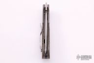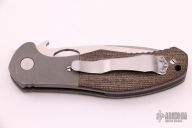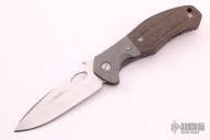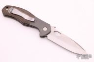 This custom CQC-10 by Ernie Emerson features a hand-ground satin finish blade, dovetailed bead blast titanium bolsters and liners, green canvas micarta scales, black G-10 backspacer, and tip up stainless steel clip. Thumbhole and Wave feature. Has scuffs on the bolsters, otherwise excellent condition.