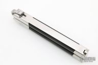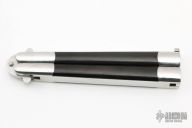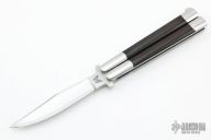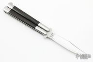 This Balisong features a satin finished blade ground by Jody Samson. The handle is comprised of integral dovetailed stainless steel handles with black linen micarta inlays. T latch on pommel. Has some scratches and has been resharpened, the knife is in good condition otherwise.