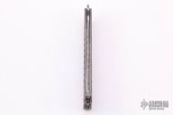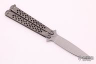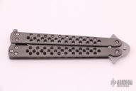 This Balisong by Craig Camerer features a stonewash finished drop point blade. The handles are bead blasted titanium with hole pattern and a stainless t-latch. Has a couple light scuffs, otherwise excellent condition.