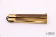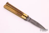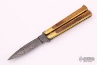 This rare Kelgin Damascus balisong has a Damascus double edged blade. The handles are brass with wood inserts and a brass T-latch. Great lockup in both open and closed positions. This knife was made in the Mid-1980s. Has some light scratches, otherwise excellent condition.