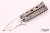 This EDC Balisong by Mikkel Willumsen features a hand rub satin finished blade. The handle has textured titanium handles, one of them has Jade G-10 inlays and a tip up clip. Has a few light scratches, otherwise excellent condition.