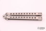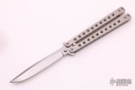 This is a Balisong by Ahron Verrinder, it features a hand rub satin finished blade. The handles are satin finished titanium with hole pattern and titanium spacers. Has some light scratches, otherwise good condition.