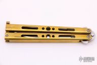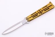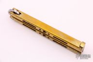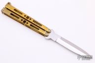 This is a Balisong by Matthew Freeman, it features a polished spear point blade with false top edge. The handles are channel construction polished brass with matching T-latch. Has some light scratches and patina, otherwise good condition.