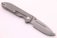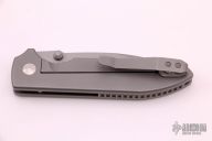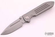 This Dauntless MK1 by T.A.D. Gear features a bead blast finished spear point blade with swedge, fullers, dual thumb studs and notched thumb rest. The handle has a milled and tumbled titanium frame over a notched titanium backspacer. The bead blasted titanium deep carry clip is positioned for right hand, tip up carry. The pocket clip is bent outward. Scuffs are visible on the blade and handle otherwise the knife is in excellent condition.