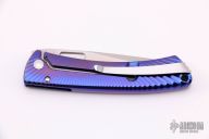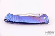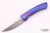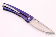 This integral frame-lock folder by Lion Steel features a satin finished spear point blade with square thumb-hole and notched thumb-rest. The handle has an anodized and milled integral titanium frame with tip up stainless steel clip. Has a very strong detent, perfect blade seating and lockup. Excellent condition. Comes with original box and papers.