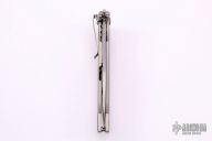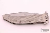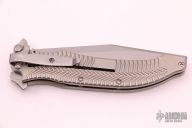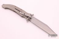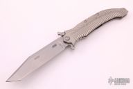 This AXD Assisted Framelock Flipper has a tumble finished tanto blade, dual thumb studs, and symmetrical flippers. Handle is bead blasted and milled titanium frame, stainless steel barrel spacers, and tip up or down stainless steel clip. Nice blade seating, nice detent and lockup. Comes with original box, papers and padded zipper case. Excellent condition.