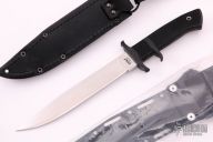 This OSI by Cold Steel features a satin finished VG-1 San Mai blade, .185" blade stock and 1.172" blade depth, hidden tang construction with a rubber handle. Comes with a molded plastic sheath and a factory black leather sheath. Comes with original box. Excellent condition.