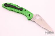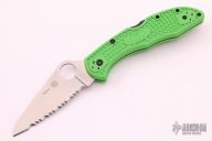 This Salt 2 knife has a green FRN handle and a LC200N steel blade with a fully serrated cutting edge.