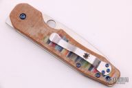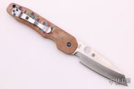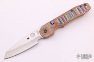 This Smock by Spyderco has a satin finish sheepsfoot style blade. The handle features custom micarta scales over stainless steel liners with a reversible stainless steel pocket tip up pocket clip, comes with anodized titanium hardware. Comes with original box and paperwork. Comes with original clip, screws and scales. Excellent condition.