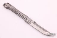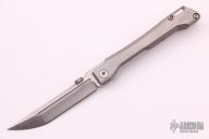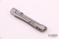 This Soldiers Pocket Knife by Darriel Caston features a satin tanto blade with notched thumbrest and thumbdisc. The handle has a milled and anodized titanium frame with matching tip up clip and backspacer. Rides on bearings, nice detent, lockup and blade seating. Comes with original box. Has some light scratches, otherwise excellent condition.