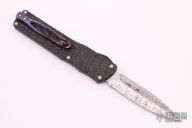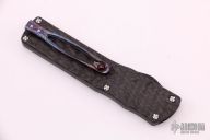 This Small Twist Tighe OTF by Brian Tighe features a Damasteel double edged blade. The handle has a milled and DLC coated titanium front, fat carbon back, tip down DarkTi clip with ruby ball insert, has ruby ball insert in the butt as a glass breaker, has a carbon fiber thumb slide. Comes with a zippered case. Excellent condition.