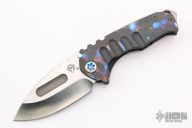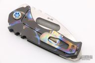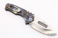This Praetorian Genesis TI from Medford Knife features a satin finished drop point blade with fuller, notched thumbrest and dual thumbstuds. The handle has a flamed titanium frame over a D2 backspacer/glass breaker. Anodized titanium tip up clip. Great blade seating, detent and lock up. Includes Medford box, papers and hardcase. Excellent condition.