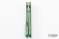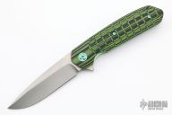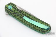 This Axiom by Richard Rogers features a blasted CTS-XHP blade with a false top edge and flipper. The handle has black/green G-10 frag pattern scales, anodized titanium barrel spacers and tip up clip. Knife has very smooth action, rides on bearings, locks up with no play, and is centered when closed. Comes with Rogers hank and COA dated August 2018. From the 2018 USN Gathering. Excellent condition.