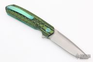 This Mid-4F by Richard Rogers features a blasted CTS-XHP blade with a false top edge and flipper. The handle has black/green G-10 frag pattern scales, acid green anodized titanium barrel spacers, liners and tip up clip. Knife has very smooth action, rides on bearings, locks up with no play, and is centered when closed. Comes with COA dated August 2018. From the 2018 USN Gathering. Excellent condition. Comes with a zippered case.