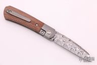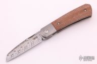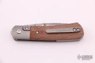 This Apache Front Flipper by Enrique Pena features a Damasteel blade with a front flipper and notched thumbrest. The handle has titanium bolsters, natural canvas micarta scales with a titanium backspacer and matching tip up pocket clip. Includes a Pena X-Series padded box.  Excellent condition.