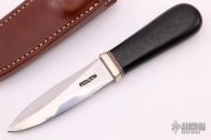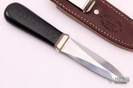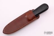 This Model 24 Guardian by Randall Made Knives features a satin finished double-edged blade with notched finger rests, .175" blade stock and .972" blade depth, hidden tang construction. Black linen micarta grip with red/white/blue spacers and a nickel silver guard. Both edges of the blade are sharpened with 1" of thumb notches. This model was designed in 1978 for use by police, undercover agents and law enforcement personnel for self-protection and as a back-up weapon. Comes with a brown leather sheath w/ boot clip. Has a few scratches, otherwise excellent condition.