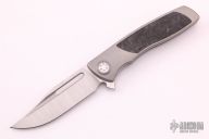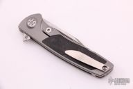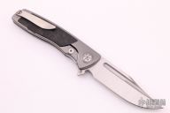 This Micro Evo from Brian Nadeau features a satin finished Bowie blade with a fuller and notched thumbrest. The handle has a bead blasted titanium frame with marble carbon fiber inlays, satin titanium tip up clip. Rides on bearings, nice detent, lockup and blade seating, stainless lockface insert. Includes original box. Excellent condition.