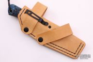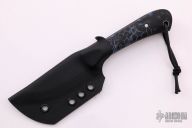 This knife by Joey Roman features a black blade with .141" blade stock and 1.001" blade depth, full tang construction. The handle has crazy C-Tek scales with blue/black resin. Comes with a brown leather sheath and a kydex sheath. Excellent condition.