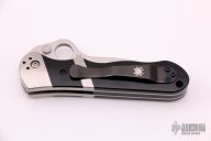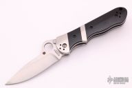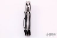 This Sub-Hilt by Spyderco features a satin finished blade with a thumb-hole, dual thumb-studs, and notched thumbrest. The handle has titanium bolsters, black G-10 scales, stainless steel liners, black G-10 backspacer, and 4-way reversible black stainless steel clip. Nice detent, lockup and blade seating. Comes with original box and papers. Excellent condition.