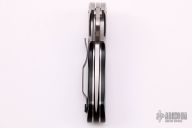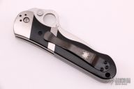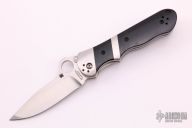 This Sub-Hilt by Spyderco features a satin finished blade with a thumb-hole, dual thumb-studs, and notched thumbrest. The handle has titanium bolsters, black G-10 scales, stainless steel liners, black G-10 backspacer, and 4-way reversible black stainless steel clip. Nice detent, lockup and blade seating. Comes with original box and papers. Excellent condition.