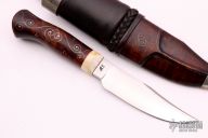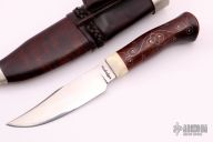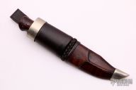 This knife by Master Smith Jay Hendrickson features a satin finished blade with a false top edge, hidden tang construction with .198" blade stock and 1.123" blade depth. The handle has a ground stag guard, curly maple handle with silver wire inlays. Includes a brown leather and curly maple sheath with nickel silver fittings and silver wire inlays, belt loop is stamped 2003 and is also stamped "5160". Excellent condition.