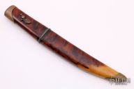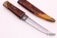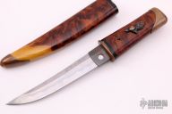 This Tanto by Scott Slobodian features a hand rub satin finished blade with a nice hamon and a hidden takedown tang construction, .201" blade stock and .940" blade depth. The handle has a copper habiki and tsuba, tsuka and saya are composed of burl wood with copper fittings. Has a few light scratches, otherwise excellent condition.