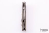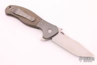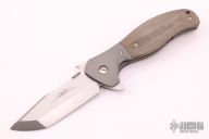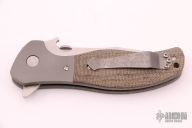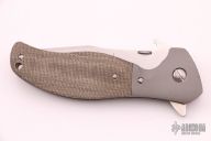 This custom Sig Legion Flipper by Emerson Knives features a satin finished chisel ground blade with notched thumbrest, thumbdisc and wave feature. The handle has dovetailed bead blasted titanium bolsters and liners, green canvas micarta scales, standoffs and tip up Steel Flame "Koi" titanium clip, tip up carry. Rides on bearings, nice detent, lockup and blade seating. Comes with original box, stainless steel clip and papers. Excellent condition.
