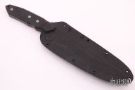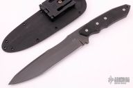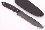 This fighter by Jeff Hall features a black blade with notched thumbrest, .213" blade stock and 1.683" blade depth, full tang construction with black G-10 scales. Coems with a kydex sheath with TekLok. Has some light scuffs/scratches, otherwise excellent condition.