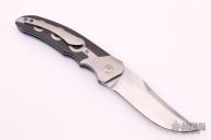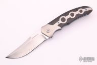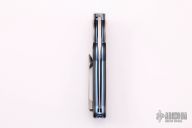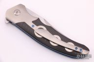 This Crux Kickstop Flipper by Lee Williams features a hand rub satin finished blade with false top edge and kickstop flipper. The handle has orange peel finished titanium bolsters inlaid into carbon fiber scales, anodized titanium liners and barrel spacers, with orange peel finished titanium tip up clip, anodized titanium hardware. Rides on bearings, nice detent, lockup and blade seating. Comes with a Bill's Velcro case. New from maker at the ICCE Custom Knife Show.
