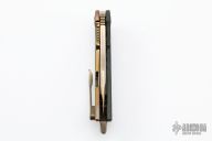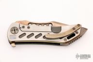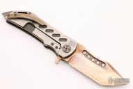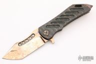This Dominator V5 by Darrel Ralph features a bronzed Damascus blade with swedge, notched thumb ramp and flipper. The handle is comprised of a copper carbon fiber "A" side scale and titanium lockside with a Damascus tip up clip and backspacer. Lanyard hole in pommel. Includes original zippered case and COA dated 6/19. Has a couple very light scratches, otherwise excellent Condition.