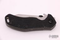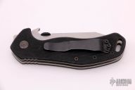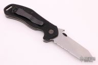 This Bulldog by Emerson Knives features a stonewash chisel ground partially serrated blade with thumbdisc, notched thumbrest and wave feature. The handle has textured black G-10 scales, titanium liners, black tip up stainless steel clip. Excellent condition. Dated 2013 and #0060.