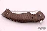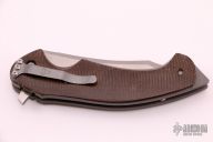 This knife by Greg Lightfoot is a Joel Pirela Design and is #11. It features a satin finished blade with flipper. The handle has brown canvas micarta scales, bead blasted titanium liners, tip down stainless steel clip. Nice detent, lockup and blade seating. Has scuffs on the liners, otherwise excellent condition.