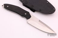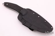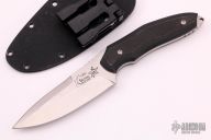This Spitfire is a collaboration between Flavio Ikoma and Ricardo and Roberto Lala of Korth Cutlery. The bottom cutting edge is 3 7/8 inches and the top swedge is sharpened 3" from the tip. Spine thickness is .151" with a blade depth of 1.357 inches. Extended full tang with thong hole providing a glass breaker feature. Scales are black G-10. Notches at the thumb rest and rear tang spine, along with a well contoured design further enhance the grip. Very nice work. Comes with a kydex sheath with small TekLok. Has a couple light scratches, otherwise excellent condition.