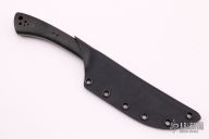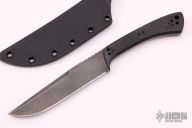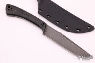This knife by Stonewood Designs features a dark tumble finished blade with fileworked thumbrest, .127" blade stock and 1.073" blade depth, full tang construction. The handle has black linen micarta scales with hollow pins. Comes with a kydex sheath. Has some light scuffs/scratches, otherwise excellent condition.