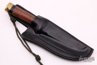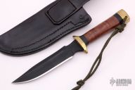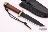 This fighter by Greg Covington features a black clip point blade with false top edge, .237" blade stock and 1.242" blade depth, hidden tang construction. The handle has a brass guard and butt, stacked leather grip with black spacers. Has a few light scuffs, otherwise excellent condition. Comes with a black leather sheath.