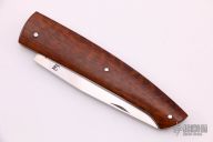 This Slipjoint by French Maker Eric Depeyre features a hand rub satin finished blade with nail nick. The handle has snakewood covers with stainless steel liners and spring. Has nice snap with opened, nice blade seating. Comes with a leather slip sheath. Excellent condition.