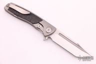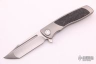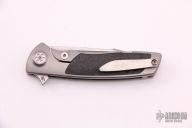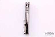 This Micro Evo from Brian Nadeau features a satin finished Harpoon blade with a fuller and notched thumbrest. The handle has a bead blasted titanium frame with marble carbon fiber inlays, satin titanium tip up clip. Rides on bearings, nice detent, lockup and blade seating, stainless lockface insert. Includes original box. Excellent condition.