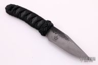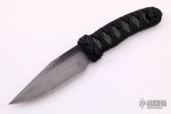 This Fixed Blade by Josh Mason features an acid etched blade with false top edge and forge finished flats, .126" blade stock, 1.104" blade depth with hidden tang construction. The handle has a Turk's head knot as a guard, and a wrapped handle over black Lizard skin. Comes with a Kydex sheath. New from maker.