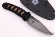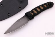 This Fixed Blade by Josh Mason features an acid etched blade with false top edge and forge finished flats, .126" blade stock, 1.104" blade depth with hidden tang construction. The handle has a Turk's head knot as a guard, and a wrapped handle over brown ray skin. Comes with a Kydex sheath. New from maker.