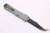 This Manticore-X by Heretic Knives features a Battleworn black bowie blade with notched thumbrest. The handle has a black aluminum frame with jade G-10 back cover, black stainless steel hardware and battleworn black tip down clip, and jade G-10 thumbslide. Comes with original box, papers and sample tube of OTF Lube. S/N 02159. Excellent condition.