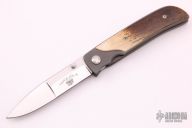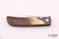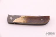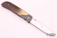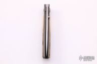 This TTF-6 linerlock by Bob Terzuola features a tumbled duplex ground blade with a single titanium thumbstud. The handle has a bead blasted titanium frame with mammoth ivory scales and a black backspacer. Smooth action. Nice detent, lockup and blade seating. Has a couple very light scuffs, otherwise excellent condition.