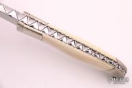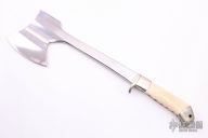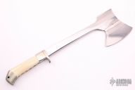 This Hatchet by Lloyd Hale and RA Frazier features a mirror polished blade with a fileworked spine and hammer poll, .329" blade stock and 4" from blade edge to hammer pole, full tapered tang construction. The handle has a nickel silver guard and dovetailed bolsters, mammoth ivory scales, fileworked tang and fileworked nickel silver liners, has lanyard hole. Has some scratches and patina, and a spot of oxidation near the nickel silver band on the blade, otherwise excellent condition for its age.