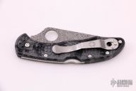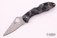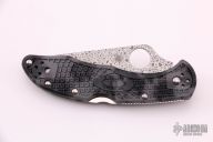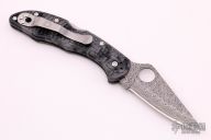 This Delica by Spyderco features a VG-10 core San Mai Damascus blade with thumbhole and notched thumbrest. The handle has a black/grey ZOME handle with stainless steel backspacer and 4-way reversible clip. Comes with original box and papers. Excellent condition.