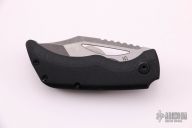 This KTC-2 by Koch Tools features a two-tone stonewashed blade with notched thumbrest and a thumbhole, this blade is a linerlock. The second blade is a prybar with a bottle opener, this blade is a slipjoint with a half-stop. Has black G-10 scales, black stainless steel center liner, dark tumbled stainless steel spring and backspacer, tip up black titanium clip with lanyard hole. Has some scratches on the blades, otherwise good condition.