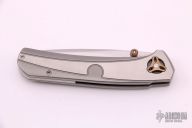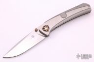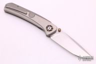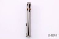 This Ollie Prototype by Brad Southard features a hand rub satin finish blade with dual copper thumbstuds. The handle is comprised of a two-tone titanium frame with an inlaid lockbar, copper pivot collars, tip up titanium clip. Nice action, detent, and blade seating. Comes with zippered case. Has a couple very light scratches, otherwise excellent condition. Originally from G8.