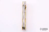 This Me-Dake by Koji Hara features a mirror polished blade and a yellow abalone inlaid thumbstud. The handle has pearl with nickel silver spacers/liners, it is sculpted to have the contours of a piece of bamboo. The blade has bamboo leaf carvings and the blade spine is also sculpted to give the piece a bamboo feel from the tip of the blade to the end of the handle. Beautiful work. Includes cloth case. Great blade seating, detent and lock up. Excellent condition. Comes with a zippered case.