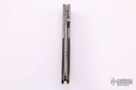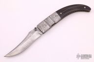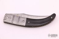 This liner-locking folder by Mel Pardue features a Damascus blade with single thumb-stud with bone inlay. The handle has fileworked and fluted Damascus dovetail bolsters, bone scales, anodized and file-worked titanium liners, and posts. Comes with a zippered case. Nice detent, lockup and blade seating, excellent condition.