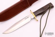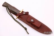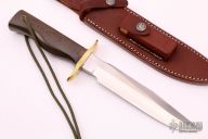 This Model 16 Special Fighter from Randall Made Knives has a satin finished stainless steel clip point blade with sharpened top edge, .220" blade stock and 1.217" blade depth, full tang construction. Handle has green linen micarta handle brass guard and lanyard tube. Stainless steel blade. Comes with brown leather sheath. Excellent condition.