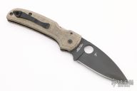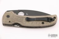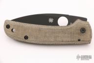 This Shaman PLN by Spyderco features black spear point blade with notched thumb and finger rests, thumbhole. The handle has canvas micarta scales, inlaid stainless steel liners and a satin finished stainless steel backspacer, lanyard hole at the butt. Has some light scuffs and scratches, otherwise excellent condition.